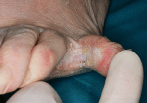 Intertriginosa: Aparece entre dos o más dedos del pie. Se aprecia erosión, descamación y enrojecimiento de la piel. En algunos casos también puede presentarse con aspecto húmedo y macerado. Suelen generar picor, o incluso escozor si existen grietas en la piel.