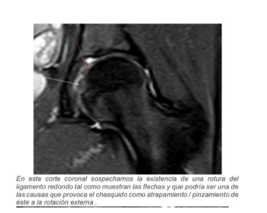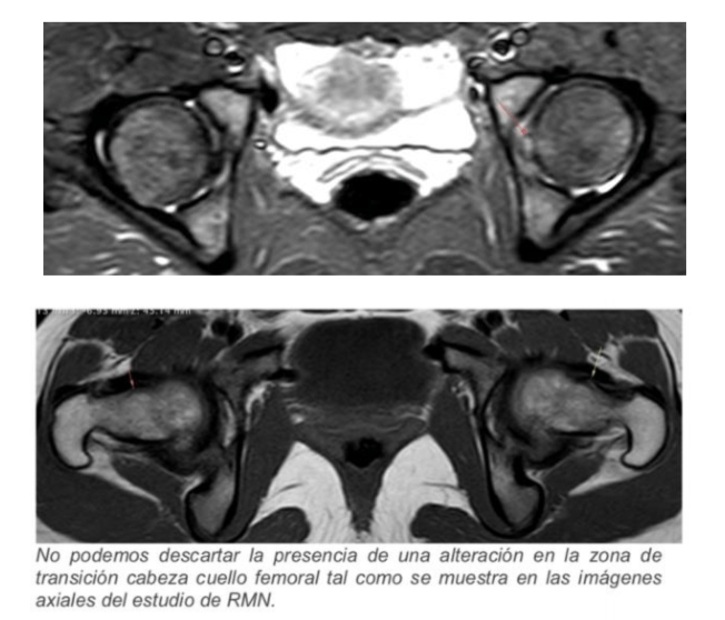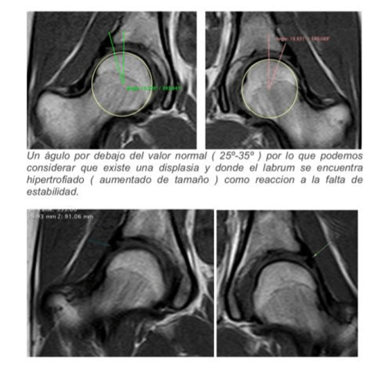 Se trata de una displasia limítrofe de 20º con una afectación del labrum. Paciente hiperlaxa con un roce fémoro acetabular evidente fruto de la lesión del ligamento redondo y de la sinovitis (inflamación que ha desencadenado).