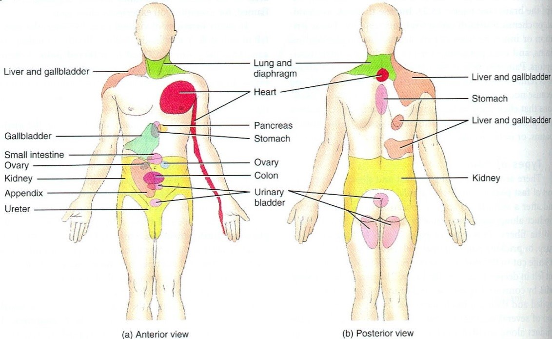 Por ejemplo, podemos presentar dolor de hombro derecho y la causa del dolor no estar en el mismo, sino en el codo, muñeca, región cervical, tórax o en el plano visceral, es decir, pueden provenir de músculo, ligamento, víscera (visceral ó somático)…