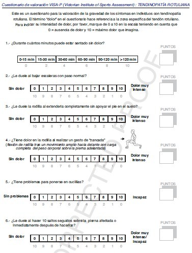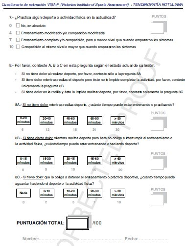 La VISA-A contiene 8 ítems que evalúan la rigidez, el dolor y la función. Ha presentado niveles aceptables de fiabilidad y validez.